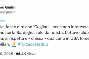 朱利尼寫道:“親愛的卡迪納萊,當你對(卡利亞里主場所在地)撒丁島的了解僅限于游客視角時,說‘沒人關(guān)心卡利亞里對陣萊切的比賽’會很容易。作為意大利球迷數(shù)量排名第八的俱樂部,卡利亞里既有觀眾關(guān)注,也備受尊重。而且誰知道呢,在美國,或許支持卡利亞里的人比支持米蘭的還多(注:在美國有很多來自撒丁島移民的后裔)。”
