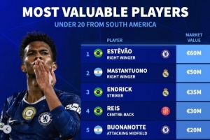 南美U20身價榜:埃斯特旺6千萬,恩德里克、羅克、埃切維里在列
