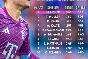 體育資訊10月19日訊 德甲第7輪比賽,拜仁在安聯(lián)球場(chǎng)以2-1的比分力克多特笑傲國家德比。本場(chǎng)比賽,拜仁門將諾伊爾迎來自己第530場(chǎng)德甲比賽,而他也取得了第363場(chǎng)勝利,這讓他超越穆勒成為德甲勝場(chǎng)數(shù)最多球員。