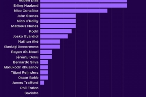 體育資訊10月31日訊 數(shù)據(jù)機(jī)構(gòu)squakwa統(tǒng)計了本賽季曼城隊內(nèi)的英超成功爭頂情況,哈蘭德和魯本-迪亞斯并列最多。