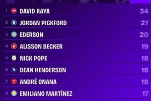 自2023/24賽季以來英超聯(lián)賽零封場次排行榜