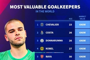 門將德轉(zhuǎn)身價(jià)排名:多納魯馬、科貝爾、拉亞4000萬(wàn)歐并列居首