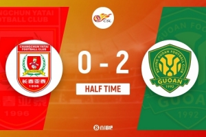 傷停補(bǔ)時7分鐘。上半場比賽結(jié)束,長春亞泰0-2北京國安。