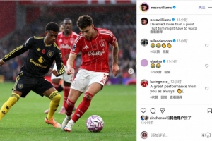 內(nèi)科-威廉姆斯社媒曬出比賽照片,配文調侃曼聯(lián)蓄發(fā)哥:“我們本應得到不止一分,理發(fā)還得再等等。”