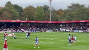 現(xiàn)場(chǎng)視頻顯示,在這場(chǎng)英乙聯(lián)賽中,一群手持英格蘭旗幟的男子沖入球場(chǎng),他們似乎穿著背后印有“加里-內(nèi)維爾是叛徒”的白色連帽衫,其中一名嫌疑人還試圖將一面英格蘭旗幟插在球場(chǎng)中央。安保人員迅速將他們拖離球場(chǎng),并在比賽暫停期間處理了此事。
