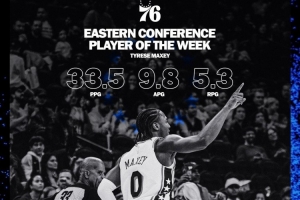 上周馬克西率領(lǐng)76人取得3勝1負的戰(zhàn)績,場均轟下33.5分5.3籃板9.8助攻。
