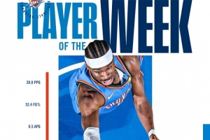 亞歷山大上周率領(lǐng)雷霆取得4勝0負的戰(zhàn)績,場均拿下28.8分4.5籃板6.5助攻。