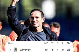 蘭帕德的球隊(duì)近4場比賽豪取4連勝且1球沒丟,4場一共打入14球:3-0伯明翰、4-0米爾沃爾、5-0謝菲爾德星期三、2-0布萊克本。目前6勝4平的考文垂以22分力壓米德爾斯堡,領(lǐng)跑英冠。