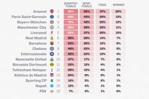 體育資訊11月05日訊 今日歐冠,拜仁客勝巴黎,利物浦擊敗皇馬,阿森納、馬競(jìng)、熱刺獲勝,那不勒斯、尤文戰(zhàn)平。OPTA更新歐冠奪冠概率。