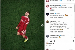 布拉德利當(dāng)選本場比賽利物浦隊內(nèi)最佳球員,賽后他在社交媒體上曬出照片,配文:“享受這場比賽,謝謝安菲爾德?!?/p>