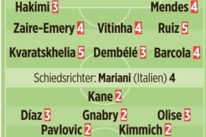 體育資訊11月5日訊 巴黎在本輪歐冠焦點戰(zhàn)主場1-2不敵拜仁,馬爾基尼奧斯送禮、迪亞斯雙響后染紅,《圖片報》在賽后為兩隊進行了評分:(1分最佳、5分最差,6分相當于負分)
