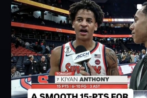 體育資訊11月5日訊 在昨天的一場NCAA比賽中,雪城大學85-47大勝賓漢頓大學??仿 ぐ矕|尼之子基揚·安東尼完成了大學正式比賽的首秀。