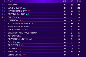 體育資訊11月5日訊 Squawka每周都會讓球迷投票選出最具爭議的VAR判罰,并列出了去除VAR爭議判罰之后的英超積分榜,阿森納23分居首,桑德蘭20分次席。