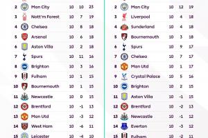 體育資訊11月06日訊 英超官方社媒更新動(dòng)態(tài),官方曬出了24/25賽季和本賽季聯(lián)賽在10輪過(guò)后的積分榜情況,并配文:你注意到了什么?