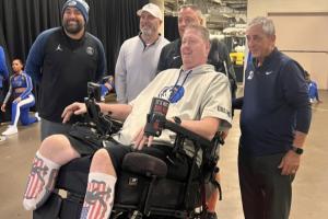 體育資訊11月06日訊 最初身高2米29的前NBA球員、53 歲的“大竹竿”肖恩·布拉德利今日坐輪椅觀戰(zhàn)獨(dú)行俠,并與他的獨(dú)行俠前隊(duì)友波派·瓊斯聊天。