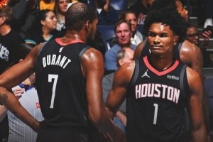 本場比賽,杜蘭特全場出戰(zhàn)34分半,18投5中,拿到11分4板5助1斷1帽,正負值+20;阿門打了38分鐘26投13中,三分3中1、罰球1中1拿到28分10籃板7助攻2搶斷,正負值+22。