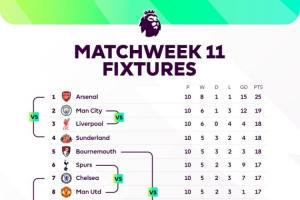 體育資訊11月07日訊 本周末將迎來英超第11輪的較量,賽前英超官方用一張圖表清晰展示了本輪交手各隊(duì)的名次對(duì)比。