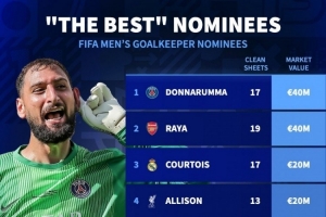 體育資訊11月7日訊 FIFA公布了年度最佳男足門將候選名單,德國轉會市場列出了入圍者身價排名,多納魯馬、拉亞4000萬歐居首。