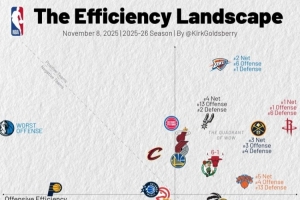 體育資訊11月7日訊 今天,數(shù)據(jù)專家Kirk Goldsberry更新了本賽季球隊的攻防效率值表。