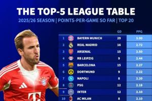 2025/26賽季五大聯(lián)賽球隊(duì)場均積分榜: