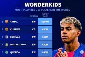 體育資訊11月10日訊 《轉(zhuǎn)會市場》統(tǒng)計了當前世界足壇U18球員身價情況,亞馬爾無懸念2億歐獨自領(lǐng)跑。