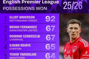 本賽季英超贏得球權榜:安德森斷崖領跑,B費、索博、凱塞多在列