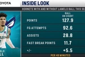 黃蜂自媒體曬出數(shù)據(jù),當(dāng)拉梅洛出站時(shí),黃蜂每48分鐘凈負(fù)8.5分,當(dāng)他缺陣時(shí),48分鐘凈勝5.5分。