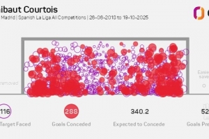 Opta指出,2018-2019賽季庫爾圖瓦加盟皇馬以來,預(yù)期失球340.2粒,而去掉烏龍球的實際失球為288粒,這意味著庫爾圖瓦阻止了52.2粒失球,五大聯(lián)賽門將同期最多。