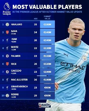 體育資訊10月17日訊 今日德轉(zhuǎn)更新英超身價,其中伊薩克漲至1.4億歐,薩卡跌至1.4億,維爾茨跌至1.3億。