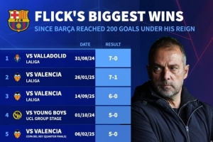 弗里克執(zhí)教巴薩最大勝利:7-0巴拉多利德居首,5-2、4-0皇馬在列