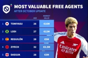 體育資訊10月21日訊 德轉(zhuǎn)更新自由球員身價(jià)排行榜,富安健洋1600萬(wàn)歐居首,雷吉隆、齊耶赫、帕科位居前十位。