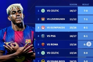 體育資訊10月22日訊 在本輪歐冠,巴薩6-1大勝奧林匹亞科斯。德轉(zhuǎn)也盤點了巴薩隊史在歐冠最大比分獲勝紀(jì)錄榜,具體如下: