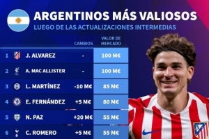 體育資訊10月18日訊 德國轉(zhuǎn)會市場更新了部分球員的身兼,并列出阿根廷球員德轉(zhuǎn)身價(jià)排名,阿爾瓦雷斯、麥卡利斯特1億歐居首。