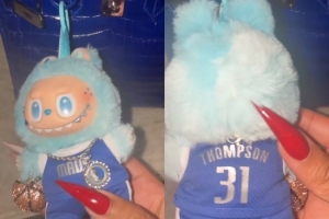 她曬出了一個(gè)特別的拉布布,這個(gè)拉布布穿著克萊的獨(dú)行俠31號(hào)球衣,脖子上還帶著獨(dú)行俠Logo的大鏈子。