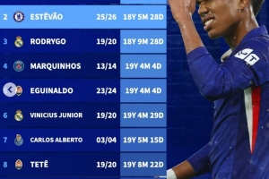 體育資訊10月23日訊 在本輪歐冠切爾西5-1大勝阿賈克斯的比賽中,埃斯特旺破門。德轉(zhuǎn)也盤點(diǎn)了歐冠改制以來(lái)巴西最年輕進(jìn)球球員榜單,具體如下: