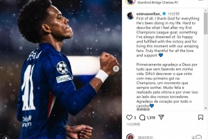 埃斯特旺社媒曬出慶祝進(jìn)球的照片,配文:“首先我要感謝上帝在我生命中的一切恩典。難以描述攻入個(gè)人首個(gè)歐冠進(jìn)球時(shí)的感受——這是我一直以來的夢(mèng)想。”