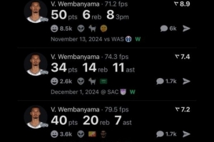 全場(chǎng)比賽,文班僅出場(chǎng)29分40秒,21投15中,三分2中1,罰球11中9,爆砍40分15籃板1助攻1搶斷3蓋帽,正負(fù)值+31。