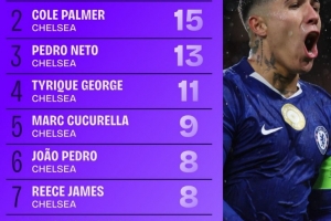 體育資訊10月23日訊 數(shù)據(jù)網(wǎng)站Squawka盤點(diǎn)了2025年切爾西球員各項(xiàng)賽事參與進(jìn)球榜單,具體如下(進(jìn)球+助攻):