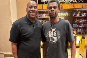 今天,NBA名宿魔術師約翰遜更推道:“在文班亞馬對陣達拉斯獨行俠的比賽中狂砍40分15籃板之前,看看我在和誰共度時光——費利克斯-文班亞馬(文班的父親)?!?/p>