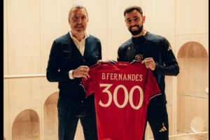 曼聯(lián)官推也曬出了B費(fèi)被贈(zèng)送印有300字樣的紀(jì)念球衣的照片,并配文:“B費(fèi)將在周六迎來他在曼聯(lián)的第300場(chǎng)比賽。”