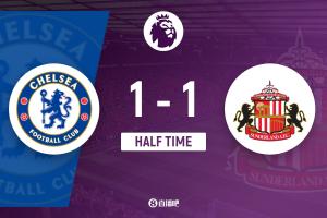 上半場傷停補時3分鐘,半場結(jié)束,切爾西暫1-1桑德蘭。