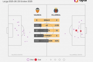 體育資訊10月26日訊 西甲第10輪比賽,比利亞雷亞爾客場2-0擊敗瓦倫西亞。