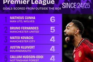體育資訊10月26日訊 曼聯(lián)在本輪英超4-2力克布萊頓,庫尼亞遠(yuǎn)射建功。數(shù)據(jù)統(tǒng)計顯示他也是上賽季至今英超禁區(qū)外破門次數(shù)最多的球員。