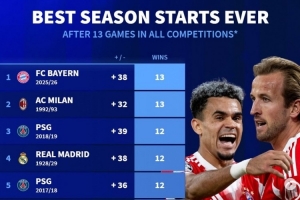1.拜仁慕尼黑 (2025/26賽季),+38凈勝球,13勝