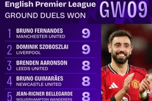 體育資訊10月28日訊 英超聯(lián)賽第9輪已經(jīng)完賽,數(shù)據(jù)機(jī)構(gòu)squawka統(tǒng)計(jì)了本輪地面對(duì)抗成功次數(shù),曼聯(lián)隊(duì)長(zhǎng)B費(fèi)和利物浦中場(chǎng)索博斯洛伊并列居首。